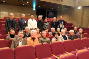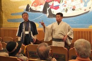 舞台の方は、日替わり編成でこの日だけの出演者が多いためか、いつにも増して熱演が続き大盛り上がり。まずは若手の月亭希遊がおなじみの「つる」、女流若手の月亭八織が「元犬」を演じる。続いて、桂よね吉の「皿屋敷」、漫才のベテラン幸助・福助、桂惣兵衛は「難読学園」、中トリは露の新治の「ふろしき」と、それぞれ大熱演で会場は笑いのウズ。仲入り後も、桂團治郎「味噌豆」、桂枝曾丸「鹿政談」と中堅の熱演が続き、先日襲名したばかりの三代目露の五郎は、落語ではなく「百面相」で会場を笑わせる。大トリの桂勢朝は、高市、小泉、麻生、吉村など政治家を模した人物が集って商店街の歌合戦を行う、という創作時事ネタ「永田町商店街懐メロ歌合戦」で会場の笑いは最高潮。会員の一人は「これまで見た中で、今日は一番おもしろかった:と大満足だった。