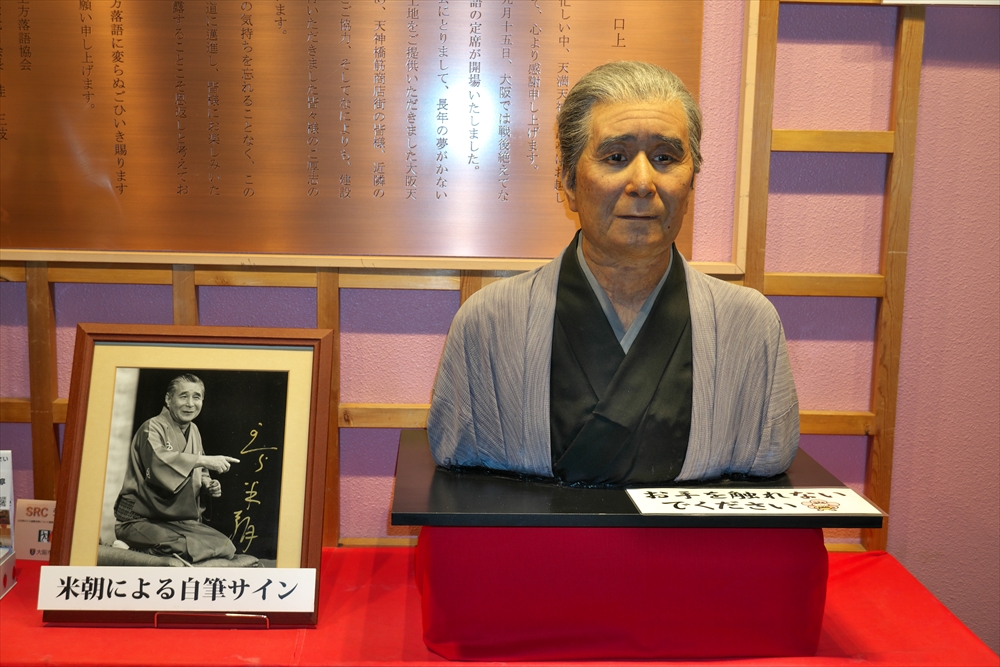 「天満天神繫昌亭」では、11月の一カ月を「桂米朝・生誕百年記念月間」と題し、いつもは週替わりの昼席を日替わりで編成しトリも毎日異なる、というスペシャルイベントを開催した。当同好会ではその中から、恩田氏おススメの米朝の直弟子・桂勢朝がトリを務める25日を選び、雨の中23人の会員が天満天神繫盛亭に集まった。ロビーでは、話題となった米朝アンドロイドがお出迎え、そのリアルさに驚かされる。